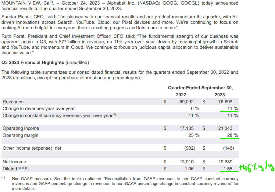 Growing hopes of a soft landing have been driving a recovery in ad spending. And this positive inflection in the business environment coupled with management’s cost-cutting measures drove Alphabet’s Q3 2023 operating income up to $21.34B (up +24.57% y/y vs. +12.3% y/y in Q2 2023) and operating margin up to 28% (vs. 25% in Q3 2022).