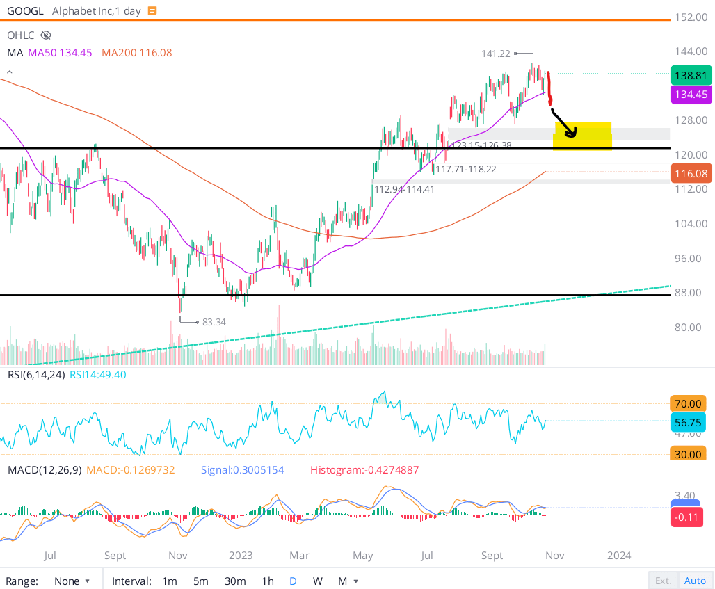 With today’s after-hours sell-off, Alphabet stock has dropped slightly below the $130 level, and technically, a re-test of the $120-125 zone is very likely now given the magnitude of the post-earnings move and the gap at $123-126.