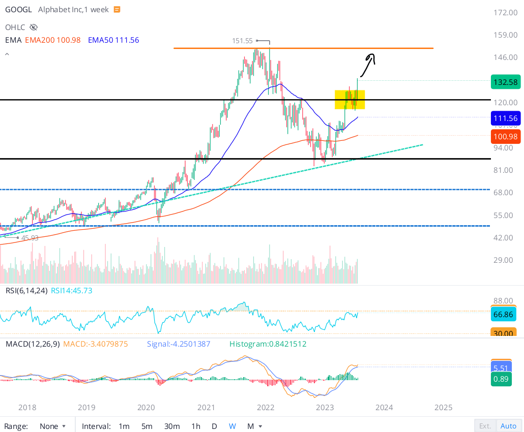 Having consolidated at the $120-$125 range before breaking out to the upside (after the announcement of Q2 earnings), Alphabet looks poised to take a run at its all-time highs of ~$150 in the coming weeks and months.