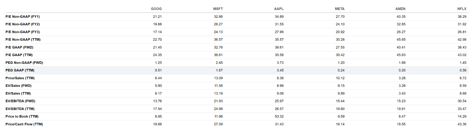 Alphabet consists of a diverse set of businesses, and it isn’t exactly comparable to any company. In some respects, it is like Microsoft Corporation (MSFT), in others like Apple Inc. (AAPL) and its YouTube business could be compared to Meta Platforms, Inc. (META) or Netflix, Inc. (NFLX). Amazon.com, Inc.’s (AMZN) retail business is quite different, but it is a major competitor in the cloud. I’ve pulled up the valuations for these mega-cap tech companies, and Alphabet stands out in terms of valuation. With Alphabet, I like to look at P/E, Forward P/E, EV/Sales, EV/EBITDA and P/FCF. Generally, it is valued between ~30%-50% lower.