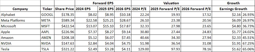 Based on the forward earnings estimates, GOOGL looks extremely undervalued. GOOGL is expected to generate $8.02 in EPS for their 2024 fiscal year, which is projected to increase by 26.93% over the next 2 years to $10.18. GOOGL is trading at 22.24 times 2024 earnings and 17.52 times 2026 earnings. These are the lowest valuations in the Magnificent Seven, and GOOGL is trading at almost half the average 2026 forward P/E of 31.96. Apple (AAPL) is trading at 30.80 times 2024 earnings and 24.83 times 2026 earrings, with 24.02% EPS growth on the horizon. Investors can get more growth at a better valuation by investing in GOOGLE rather than AAPL at these levels.
