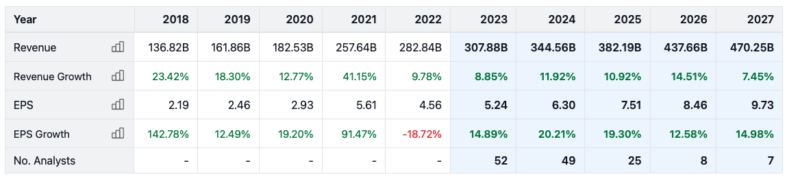 The consensus among analysts covering Alphabet is that the growth rate will decline in ’23 and that there will be low double-digit growth over the next five years.