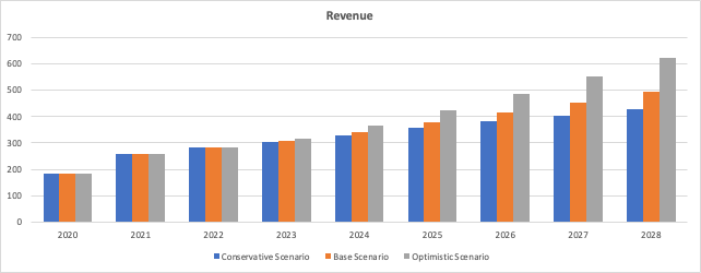 Three scenarios have been created to reflect potential future outcomes, all of which predict a slowdown in growth rate in ’23, followed by a recovery in ’24 after the restructuring, and a gradual decline in growth until ’31. Terminal growth rate (TGR) is indicated for each scenario after the 10-year period.