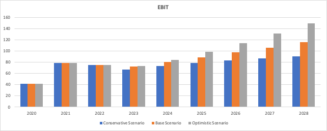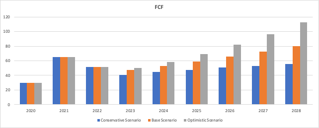 To determine the fair value of the enterprise, we discount the business’s future cash flow for each scenario, add the available cash balance sheet, and deduct the debt. Based on these scenarios, we have generated the following stock price targets: