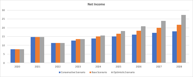 Alphabet’s tax rate has been stable year over year and we project a similar tax level in the future as the historical averages. The Conservative scenario has a tax rate of 19% whilst the most optimistic scenario is 18.5%, i.e., small differences between scenarios to calculate the net income.
