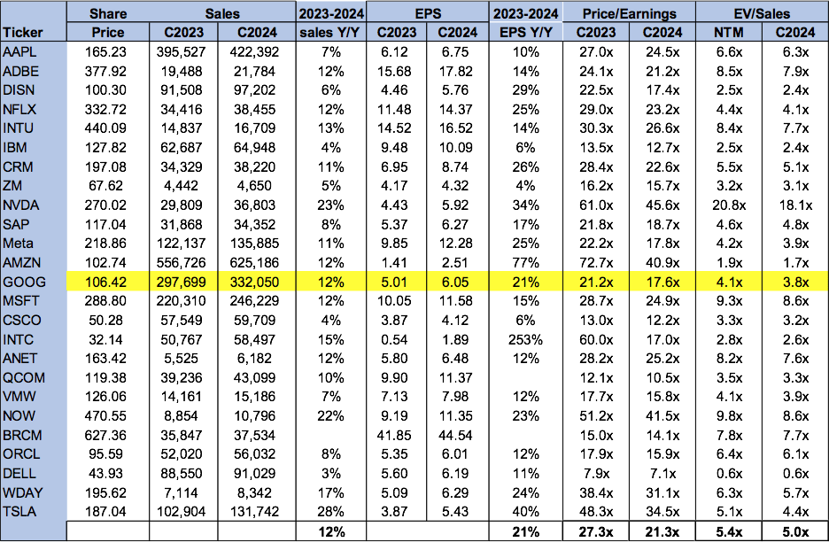 Alphabet stock is relatively cheap, trading below the peer group average. On a P/E basis, the stock is trading at 17.6x C2024 EPS $6.05 compared to the peer group average of 21.3x. The stock is trading at 3.8x EV/C2024 Sales versus the peer group average of 5.0x. We recommend investors not buy the stock based on weakness as we see further downside toward 2H23.