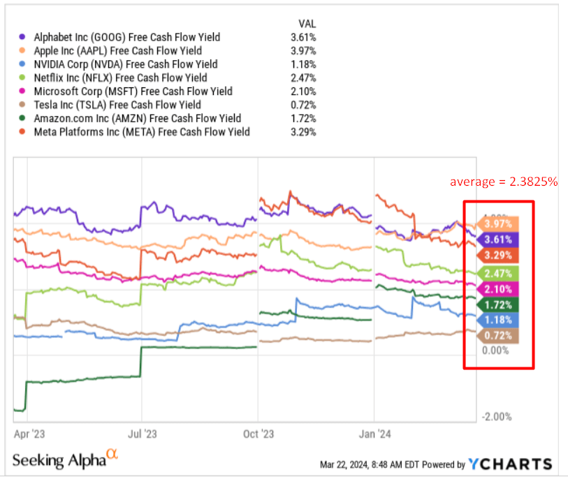 As far as I can see, Google’s FCF yield of 3.61% makes the stock about 50% undervalued to an average “Magnificent 7” stock out there: