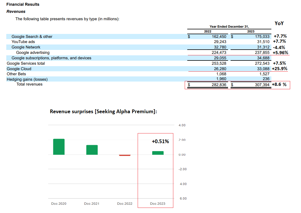 In Q4 FY2023, Google showed a 15% YoY increase in consolidated net revenue ($72.3 billion), driven chiefly by an 11% rise in advertising revenue, totaling $65.5 billion (i.e. >90% of the total). This growth was driven by a 13% surge in Search advertising and a 16% uptick in YouTube ads (both YoY) mainly thanks to the strength of the retail sector. Google Cloud also showcased substantial improvement, reporting a 26% YoY revenue jump, while the Subscriptions Platforms & Devices segment also experienced a noteworthy 23% revenue growth. Thanks to the strong figures for the last quarter, the results for the year as a whole were also better than Wall Street analysts had expected.