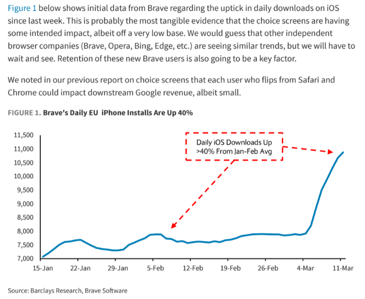 First, the European Union’s new regulation, the Digital Markets Act (DMA), came into force in March 2024. Simply put, the DMA “describes what digital industry leaders — called gatekeepers by the DMA — can and cannot do, based on what is considered fair or unfair business practices.” According to Barclays’ recent study (proprietary source), it appears that Google is rolling out choice screens to all users (not just new phones). Alternative browsers (apart from Safari and Chrome) are becoming increasingly popular, so it can be assumed that Brave’s download dynamics also apply to its peers.
