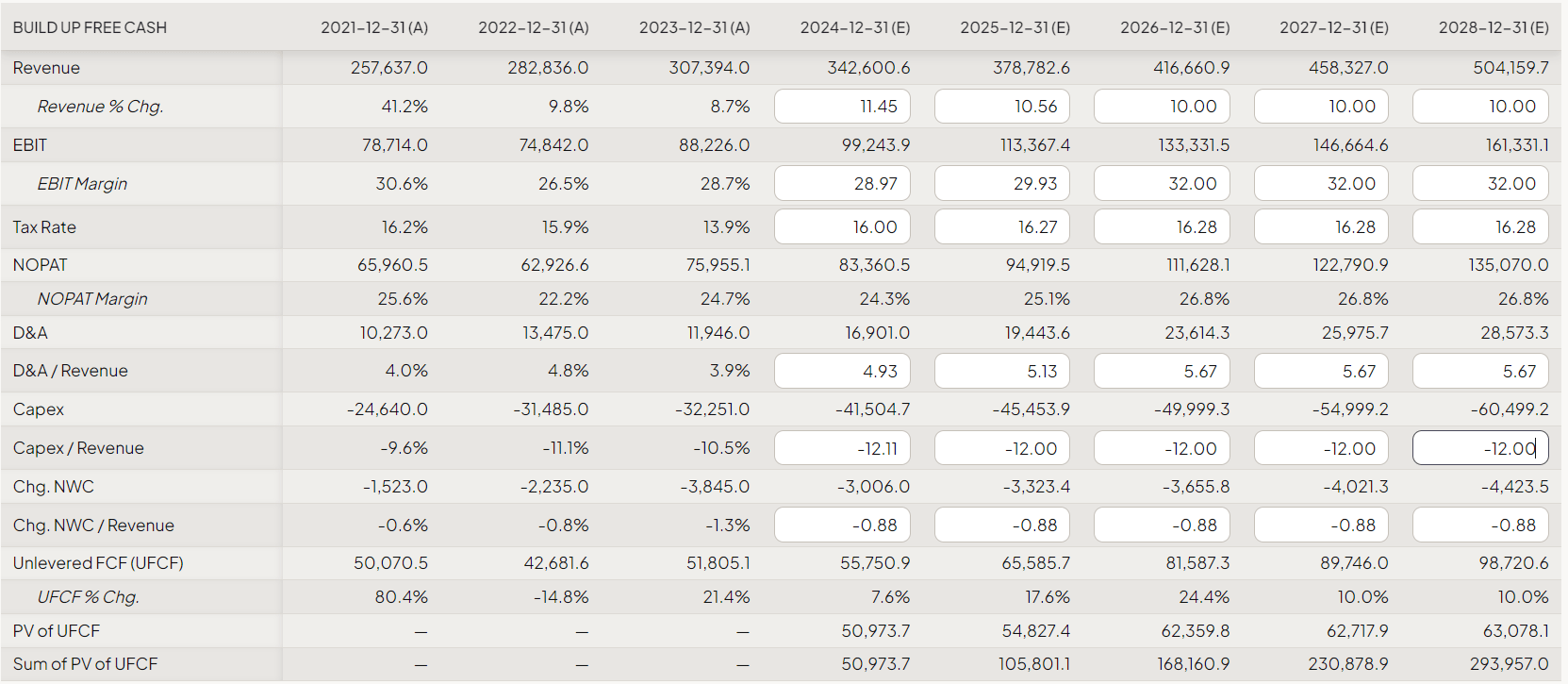 Let’s make a simple DCF model to find out. Let’s assume that the current consensus estimates for revenue growth rates are approximately accurate – moreover, Google’s revenue will grow at a slight premium to today’s consensus over the last 3 forecast years. I also expect Google to gradually reach an EBIT margin of 32% by 2026 and maintain this high mark until the end of the model forecast, despite the cyclical nature of its business. We also know from management’s words that the company plans to spend more on CAPEX – this is logical for the time of existence against a backdrop of disruptive innovation in the industry. So this is what my initial inputs will look like: