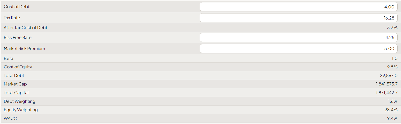 Having a cost of debt of 4%, a risk-free rate of 4.25%, and an industry-accepted MRP of 5%, we get a WACC of 9.4%.