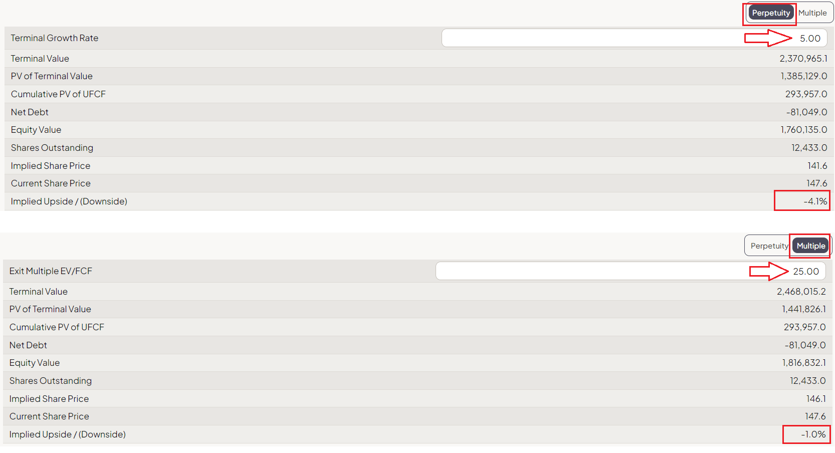 For the firm’s terminal value, I suggest using 2 options at once: Gordon’s “g” rate and the exit multiple of EV/FCF. In the first option, I assume that Google’s business will grow at an annual growth rate of 5% (“in perpetuity”), and in the second option, I assume that GOOG’s EV/FCF will be 25x at the end of the last forecast year.