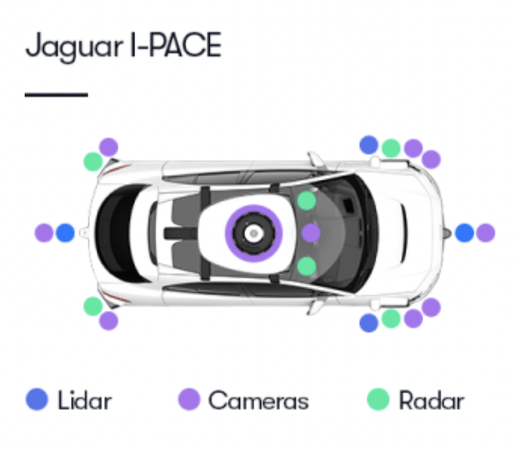 The hardware for Waymo vehicles is getting cheaper. Their 5th generation Jaguar I-PACEs have 29 cameras, and Tangram gives a detailed breakdown. Waymo’s 6th generation vehicles have just 13 cameras. Here is a diagram of the I-PACE hardware: