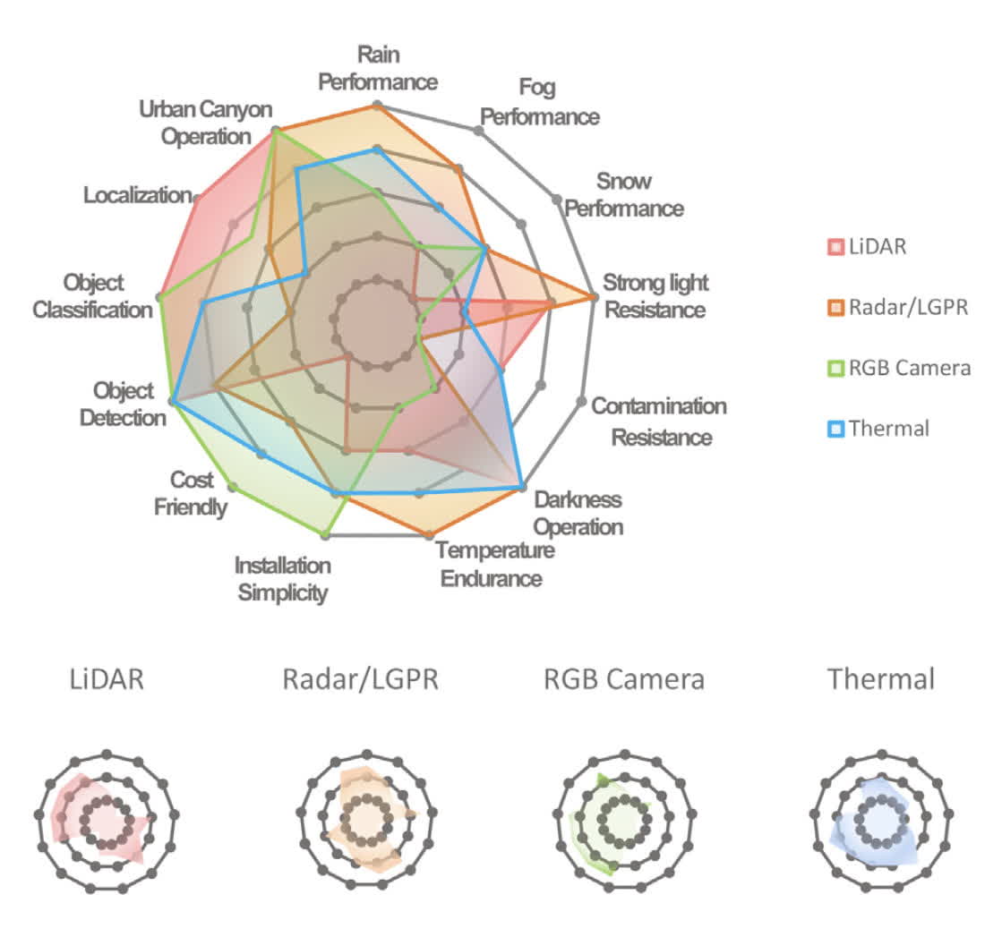 A February 2023 Perception and sensing for autonomous vehicles under adverse weather conditions paper by Yuxiao Zhang et al. breaks down sensor performance in a diagram, and we have to review some terms to appreciate the ramifications for the robotaxi race. Urban canyons are formed when a street is densely populated with tall buildings on the sides. Quoting from a 2018 paper by Fallah Kuutti et al., the Yuxiao Zhang paper defines localization as follows: