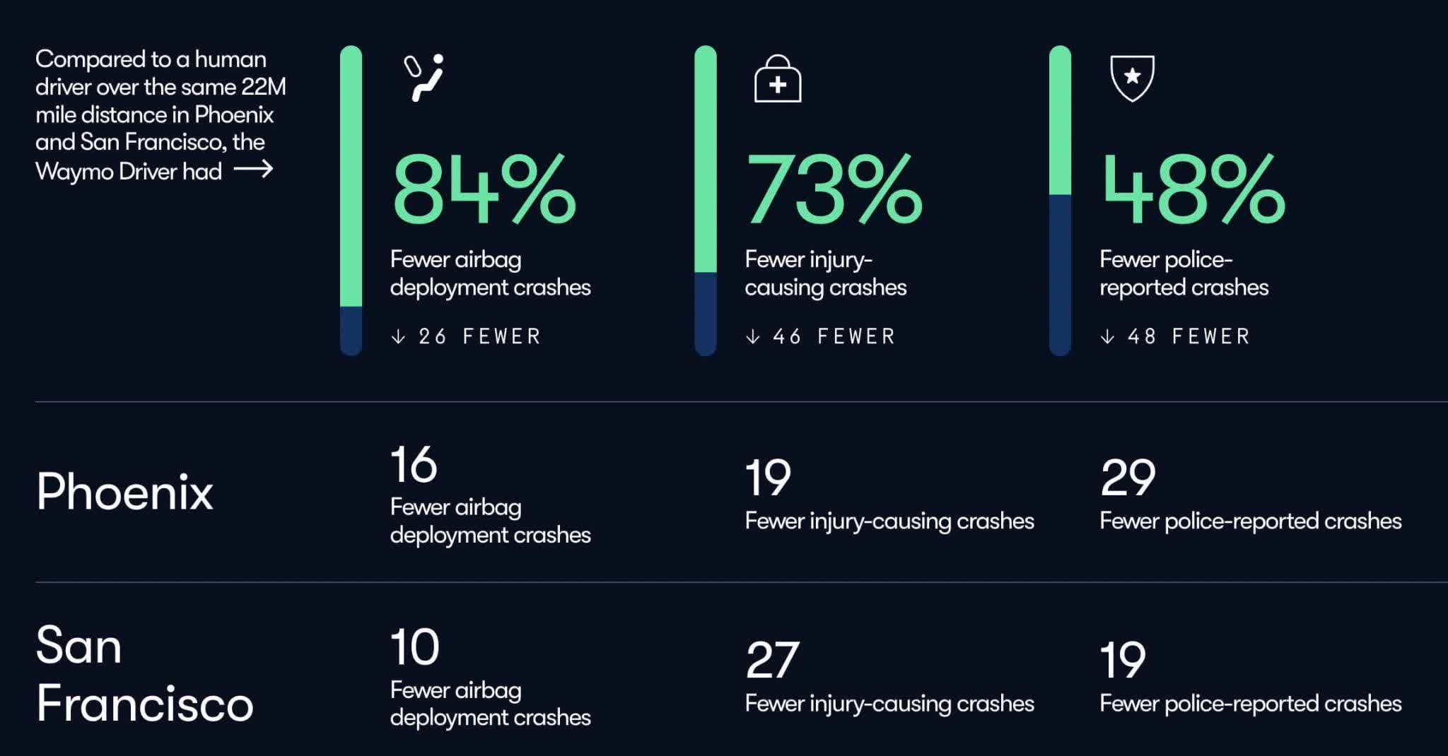 Per the above report, Waymo has fewer crashes than human drivers on average. The Waymo numbers from approximately 22 million miles show 48% fewer police-reported crashes, 73% fewer injury-causing crashes and 84% fewer airbag deployment crashes relative to human drivers: