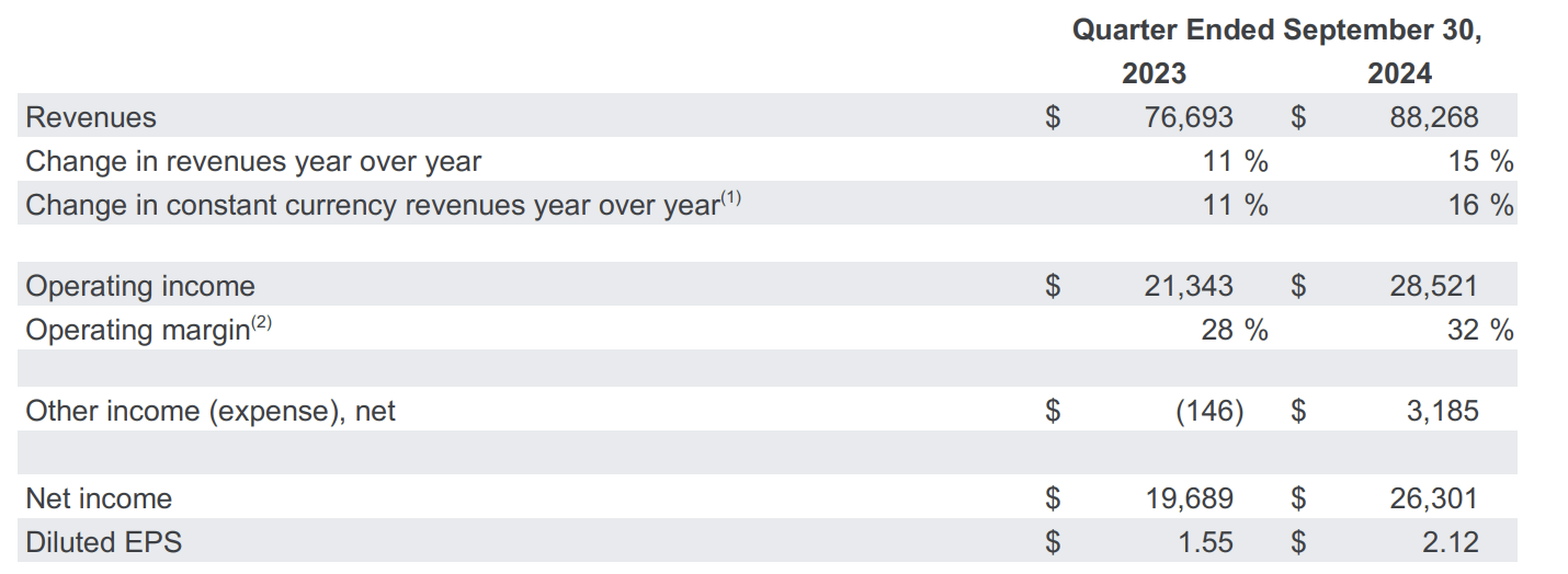 - Alphabet Inc. aka Google reported impressive 3Q 2024 earnings with 15% revenue growth and a 4% increase in operating margin, leading to strong net income growth.