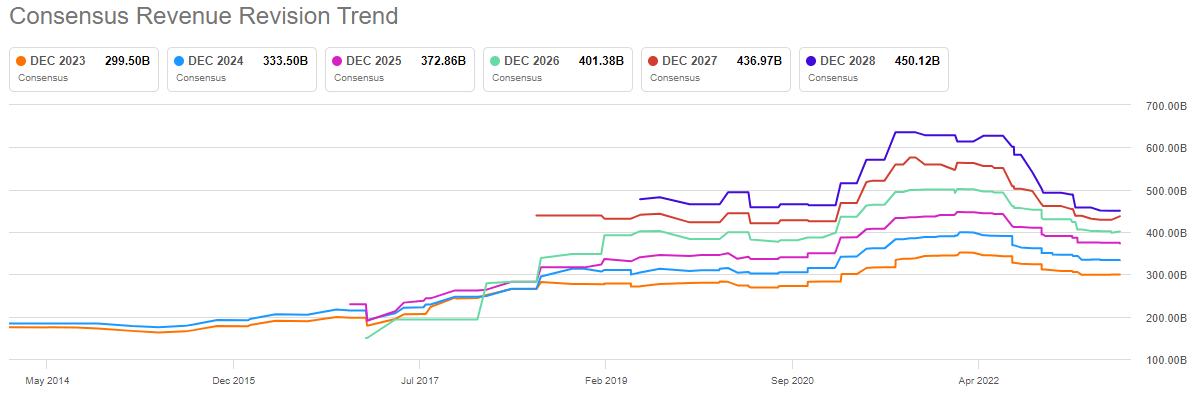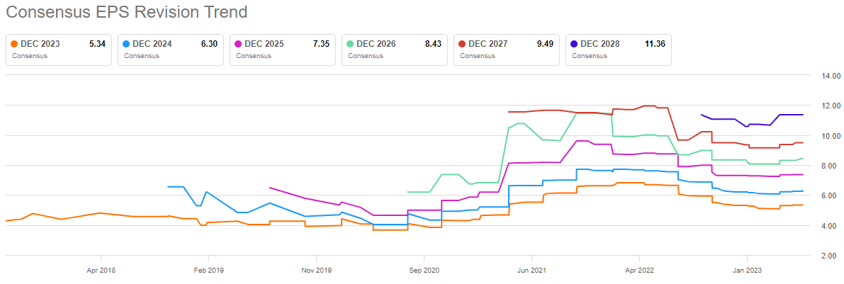 We can see actual revenue growth rates annually and estimates for the next few years, and the bottom is this year at 6%. Estimates are for double-digit growth in 2024 and 2025, which is exactly why I think the stock will be revalued higher once more in the coming months in anticipation of that.