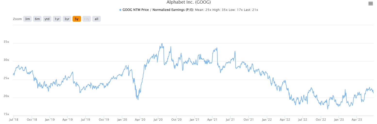 The valuation has moved higher in recent months with the share price, as the share price has outpaced gains in EPS revisions. However, as we can see below with the 5-year chart of forward P/E ratios, Alphabet still looks cheap to me.