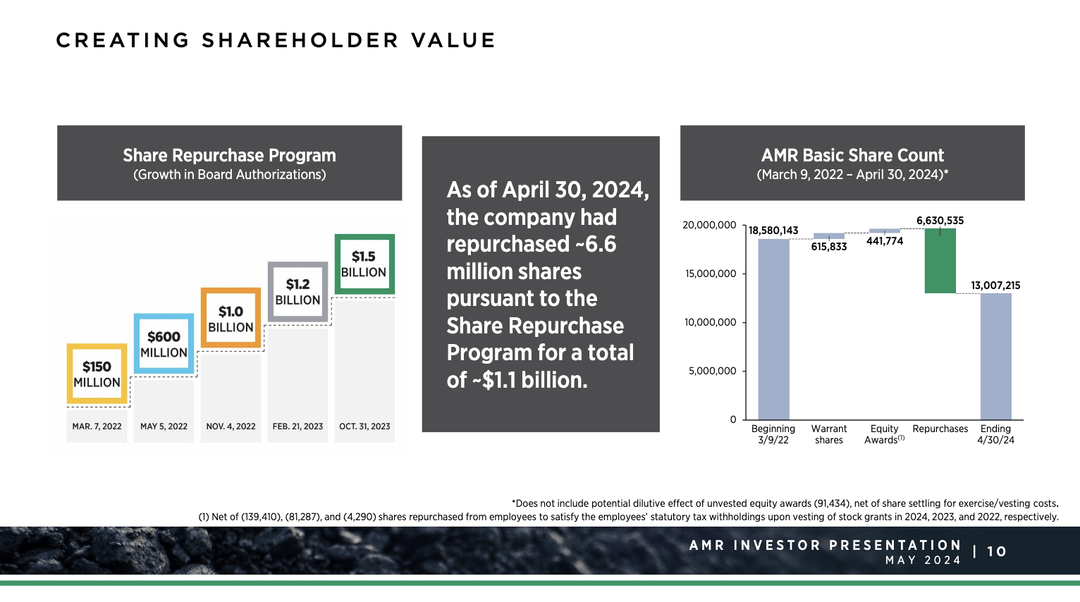 - Short-Term Headwinds: Recent earnings reflect industry headwinds, leading AMR to slow its aggressive buyback program to focus on financial stability.