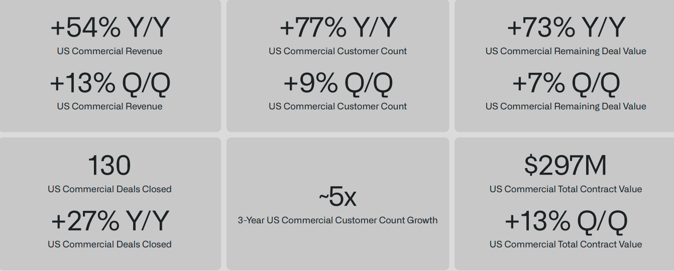 - U.S. commercial revenue grew 54% year-over-year, and U.S. government revenue saw its strongest sequential growth in 15 quarters, driven by increased DoD business.