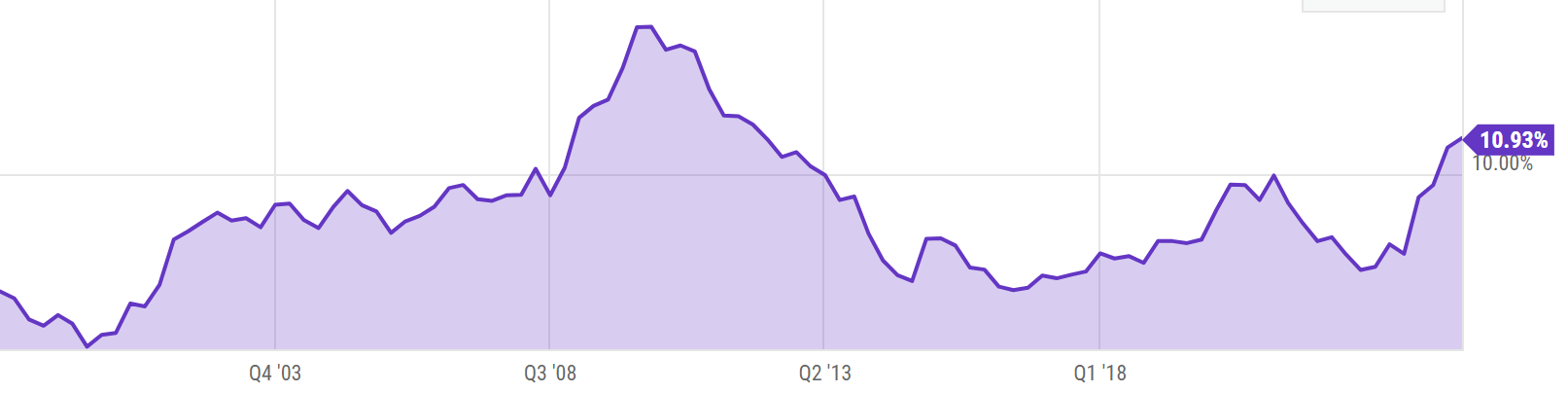 US Credit Card Delinquency rates for more than 90 days (YCharts)