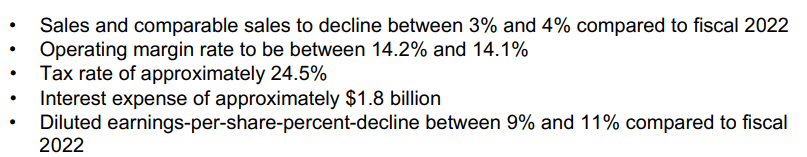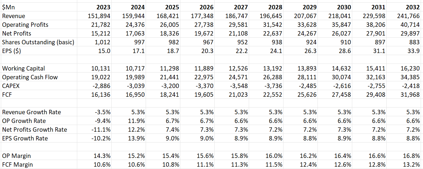 The assumptions for FY23 align with Home Depot’s guidance, taking into account the three quarters reported during this fiscal year. Anticipating a return to stabilization in the market and a trajectory back to pre-COVID conditions, I am assuming a 5.3% comparable sales growth, consistent with their historical average excluding the COVID period. The expected margin expansion is attributed to operating leverage and the implementation of cost-reduction initiatives.