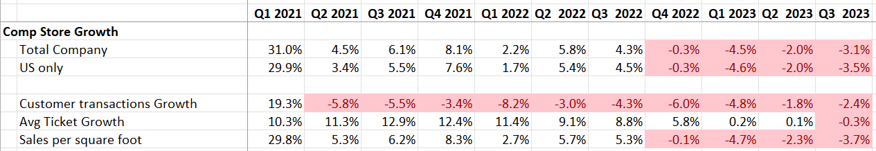 During Q3 FY23, comparable sales witnessed a year-over-year decrease of 3.1%, attributed to a -2.4% decline in transaction growth and a -0.3% dip in average ticket growth. This outcome aligns closely with the company’s expectations and slightly surpasses the market consensus. As highlighted in a previous article, the big-ticket discretionary categories persist in facing challenges. Consequently, big-ticket comp transactions, specifically those exceeding $1,000, experienced a year-over-year decline of 5.2%.
