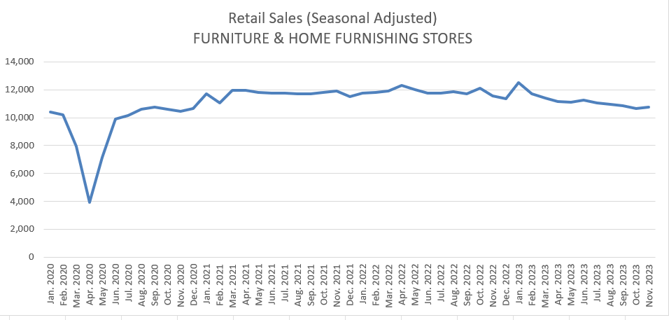 Secondly, the retail sales for furniture and home furnishing stores are gradually moderating toward pre-COVID levels, as depicted in the chart below. This moderation in demand supports a more rational market and helps establish an equilibrium between supply and demand.