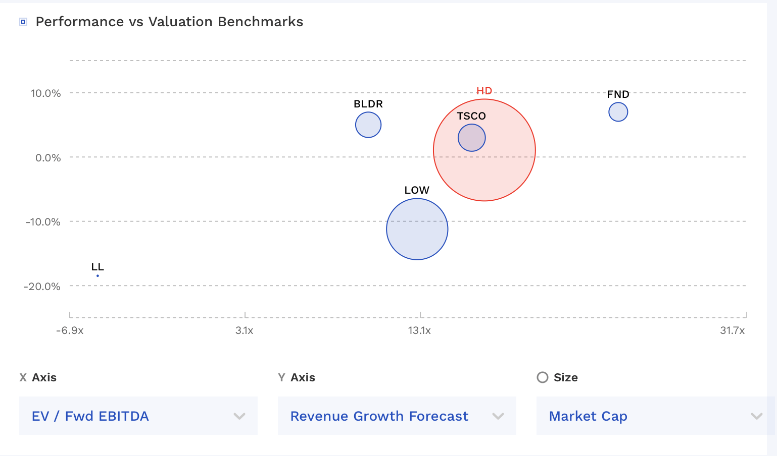 HD stock currently trades around 16.5x the FY2024 (ending January 2025) consensus EBITDA of $25.48 billion and 16.0x the FY2025 (ending January 2026) consensus of $26.16 billion.