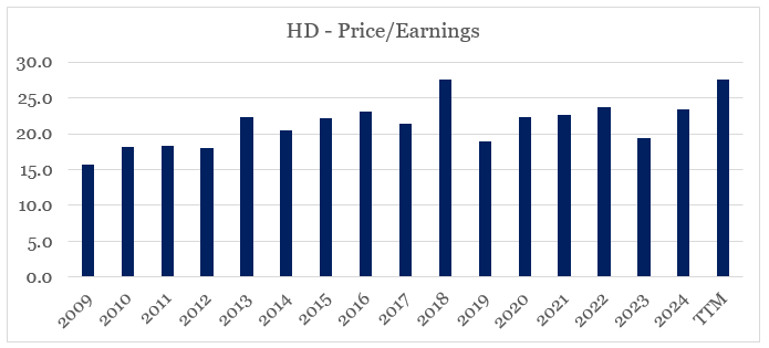 As we saw above, HD stock is now trading at almost 28 times its current GAAP earnings. The only time since 2009 when the stock had a similar P/E ratio was back in 2018, but the high earnings multiple back then was in response to the Tax Cuts and Jobs Act, which reduced the company’s provision for income taxes from more than $5bn to roughly $3.5bn.