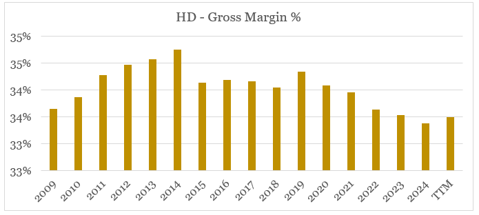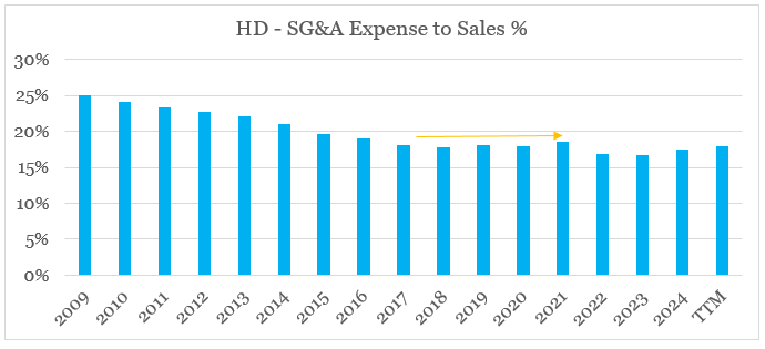 Over the past decade or so, Home Depot’s operating margins benefited from significant economies of scale and technological innovation which improved efficiency. Namely, software implementations, self-checkouts and other initiatives have allowed HD to reduce its selling, general and administrative spend relative to sales.