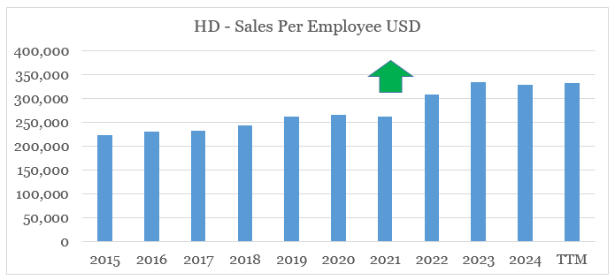 As a result, sales per employee have been on an upward trend over the past 10-year period, especially following the pandemic when demand for home improvements accelerated and the share of self-checkouts increased.
