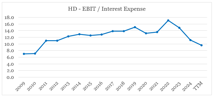 This notable increase in debt in combination with the now normalizing interest rates has resulted in a rapid deterioration of HD’s interest coverage in recent years – a trend that could reverse in the short term, but will continue to put pressure on HD’s net income margins for a very long time.