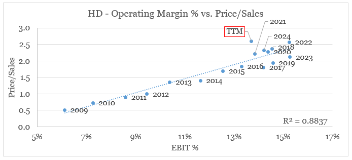 We could also see how overpriced Home Depot share price is by looking at the long-term trend between the company’s operating margin and the stock’s Price/Sales multiple.