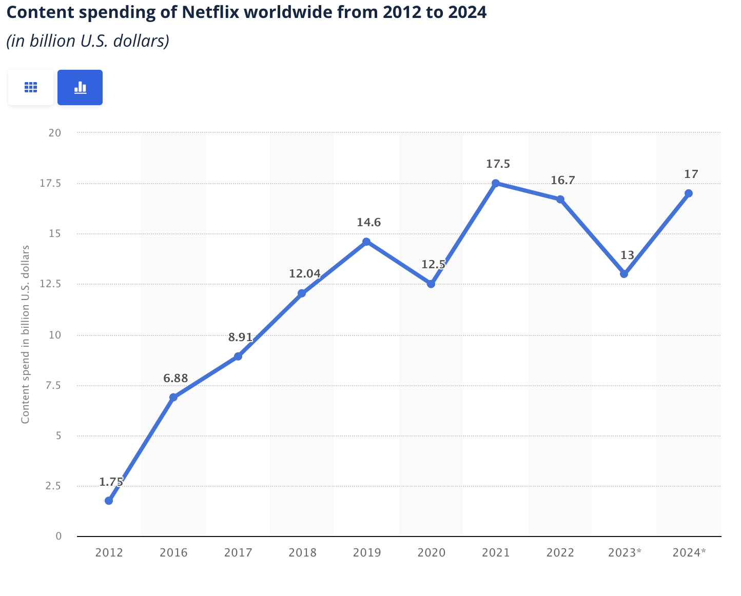 - Netflix plans to boost its content investment to $17 billion by 2024, aiming to enrich its library and strengthen subscriber attraction and retention.