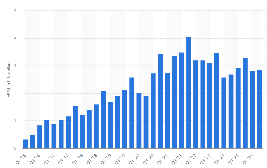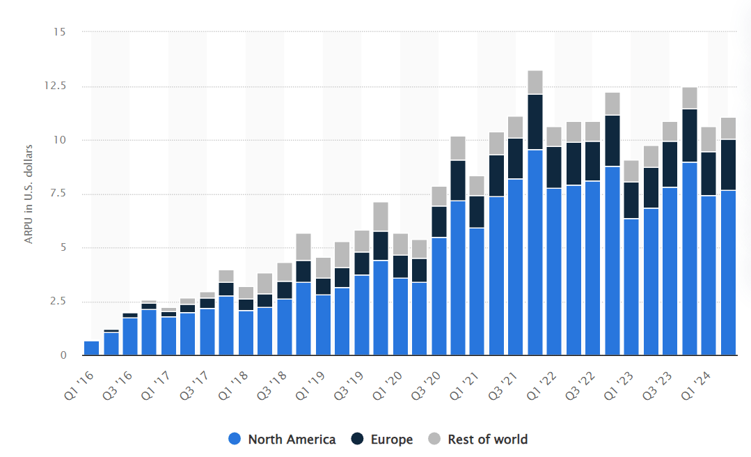Snapchat has not been able to hold on to any growth momentum in this metric for the last few years, falling to below 2021 highs of over $4/user.