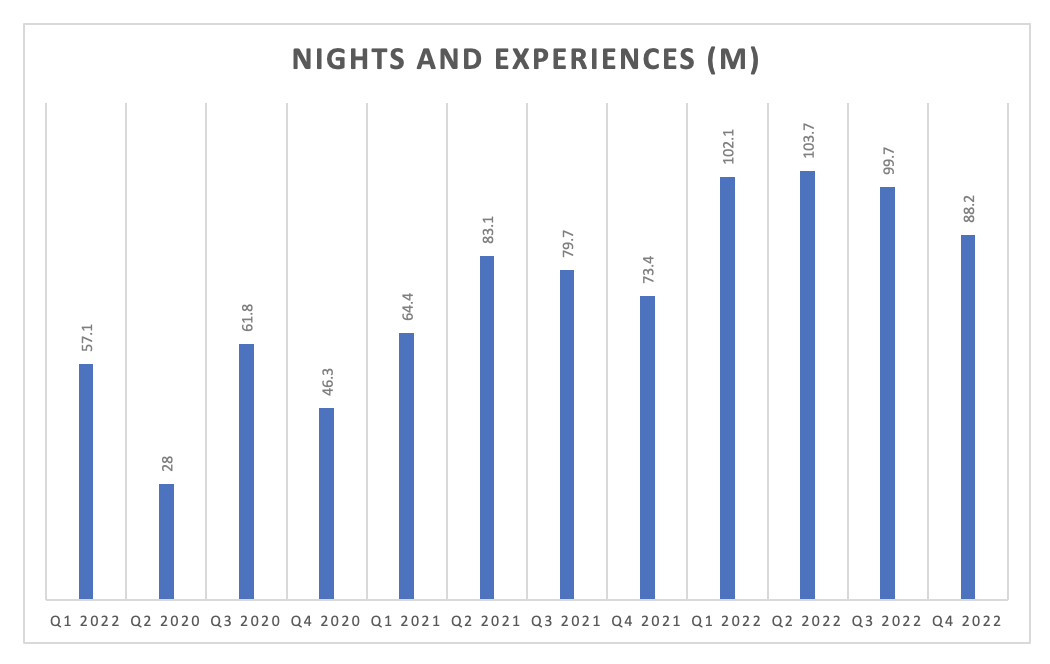 As evident in the chart above, nights and experiences tapered off toward the end of last year. However, this pattern is consistent with previous years, where Q1 and Q2 typically experience a surge followed by a decline (with 2021 being an exception due to the pandemic).
