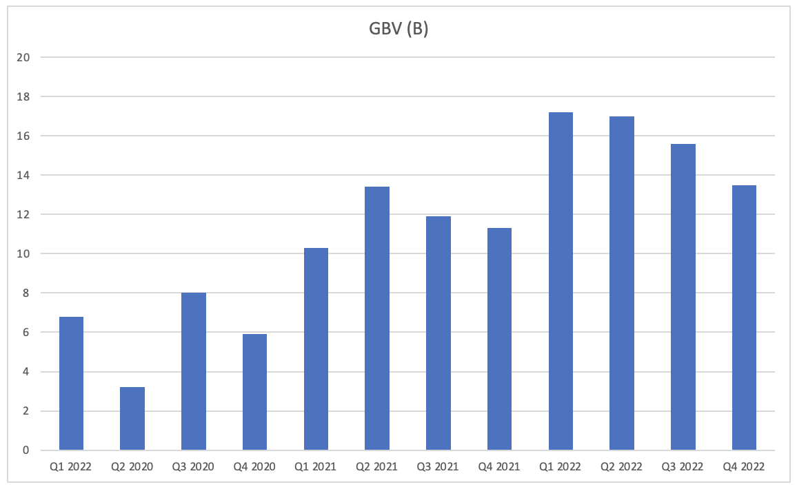 Lastly, by essentially combining the two charts above, we arrive at gross booking volumes. As we approach Q1 earnings, we anticipate seeing a boost in this metric.