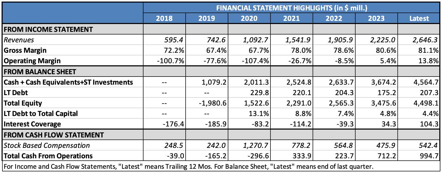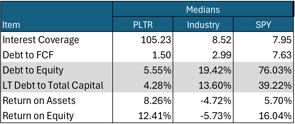 Turning now to PLTR, go back to the last table in the preceding section. Not only does it have good returns on assets and equity, but it also has close to zero debt.