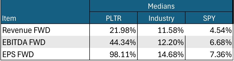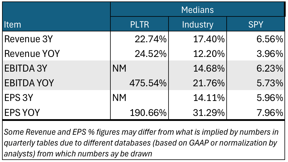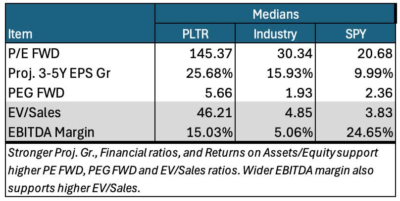 (I compare PLTR to medians for companies in the SPDR S&P 500 ETF Trust (SPY) and the Application Software industry. I use medians since these aren’t impacted by wild distortions often caused by unusual data items, even in big companies that can dominate weighted averages.)