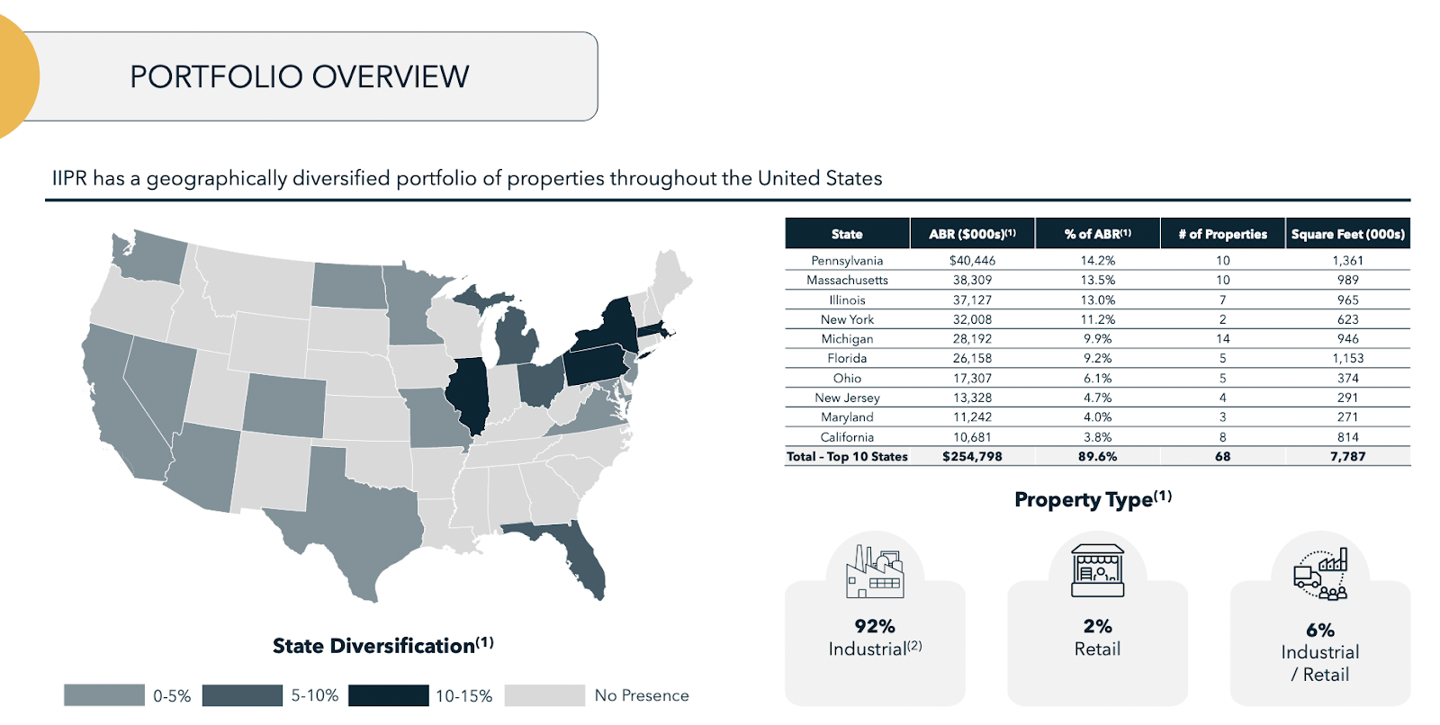 IIPR is the largest publicly traded landlord of cannabis cultivation properties (it does have a small amount of retail dispensary properties). The company is primarily located across 10 of the most significant cannabis markets, many of which have already legalized adult-use sales.