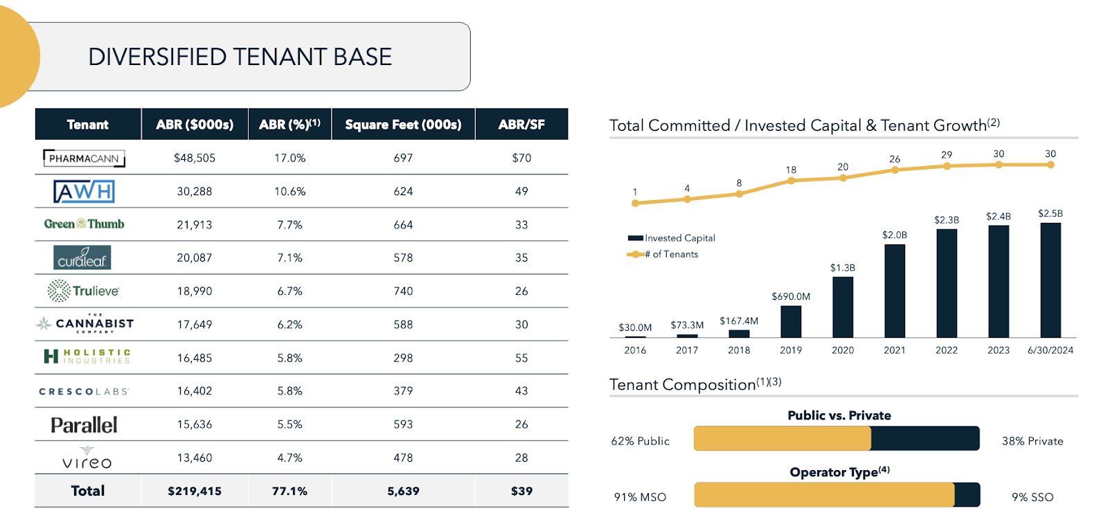 The company’s tenant roster includes all of the well-known names, including Green Thumb Industries (OTCQX:GTBIF), Curaleaf (OTCPK:CURLF), Trulieve (OTCQX:TCNNF), and Cresco Labs (OTCQX:CRLBF), which were once known as “The Big 4” of US cannabis.