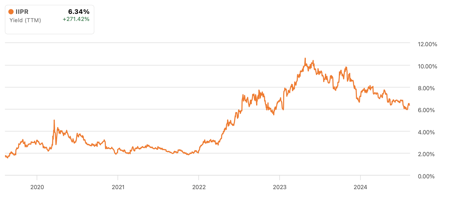IIPR management deserves great praise for their swift and efficient handling of the last several years, as they have worked through large tenant defaults such as King’s Garden in California. The stock had briefly sold off into a double-digit dividend yield but the market has rewarded the stock price given the strong execution. The stock recently traded hands at around a 6.2% dividend yield.