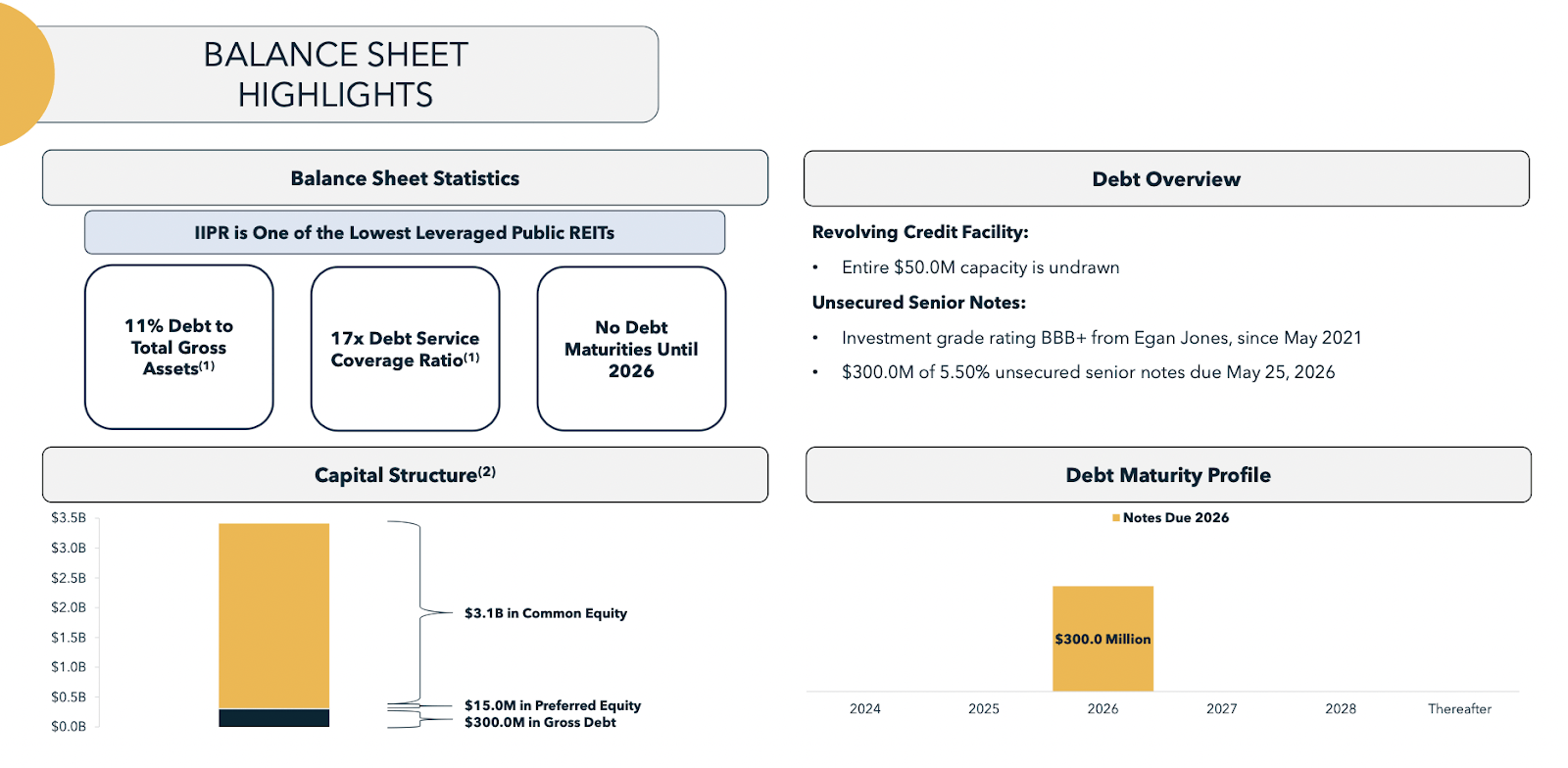 IIPR ended the quarter with $297 million of debt, which represents just a hair over a 1x debt to EBITDA ratio. For reference, traditional net lease REITs like Realty Income (O) typically have ratios in the 5x debt to EBITDA range. These notes do not mature until 2026 but due to the low leverage profile, I am not concerned about refinancing risk.