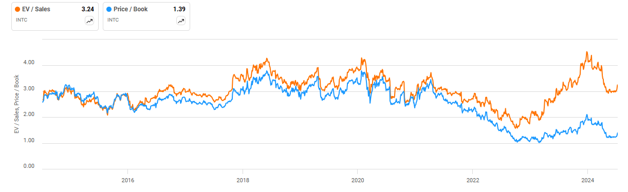Lastly, while it is uncommon to focus on P/B metrics to evaluate a semi stock, we should remember that INTC is a value play with distressed fundamentals. The stock is trading at 1.4x P/B TTM, which is 37% below its 10-year average. Therefore, I believe the current stock’s valuation is very appealing given its potential growth inflection in FY2025.