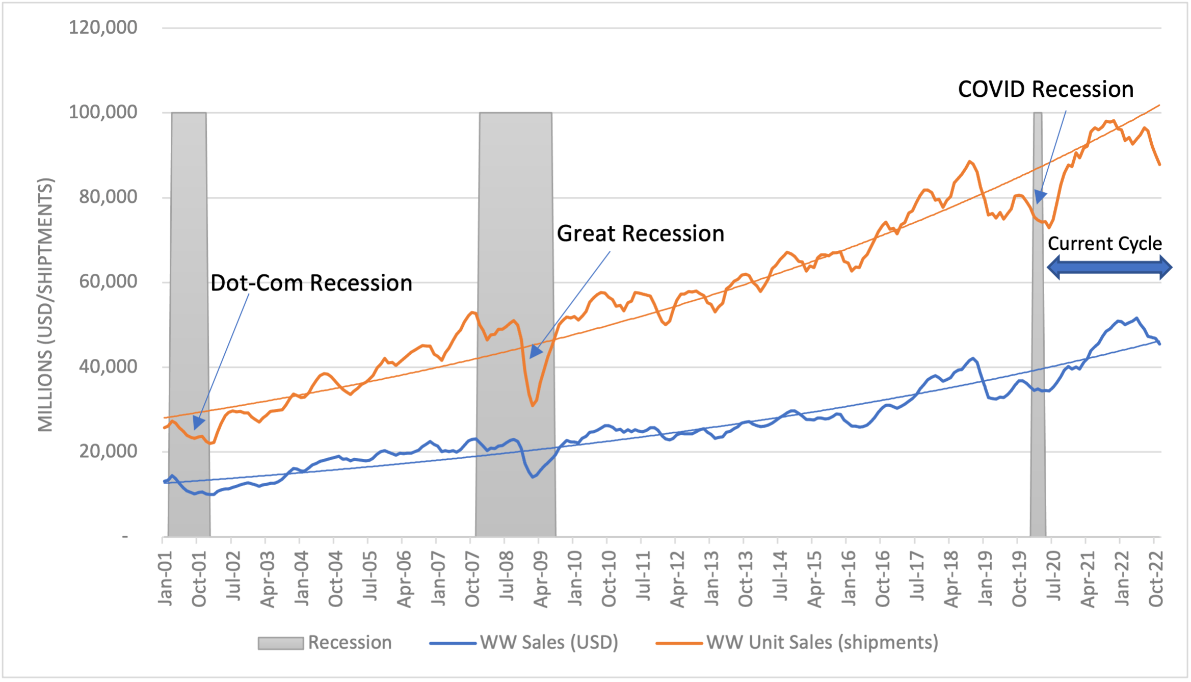 Shortage and Strong Demand (2021-2022): The industry experienced a severe shortage of semiconductors, impacting various sectors such as automotive, consumer electronics, and industrial equipment. High demand and supply chain disruptions and capacity constraints contributed to the shortage.