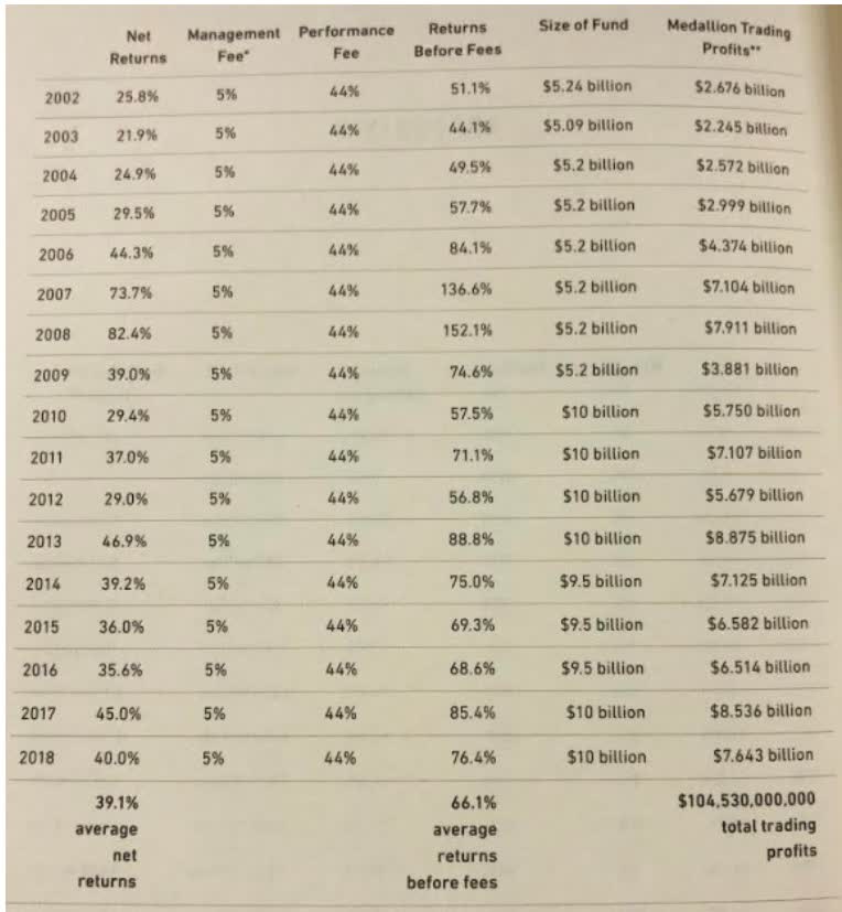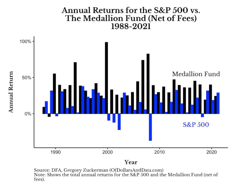 Renaissance’s flagship Medallion Fund generated 62% annualized returns (before fees) and 37% annualized returns (net of fees) from 1988-2021…