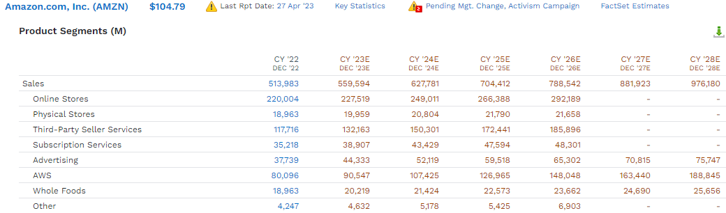 We are impressed that Amazon’s advertising revenue growth meaningfully outpaced internet advertising giants Meta (META) and Alphabet (GOOG) (GOOGL). AWS was our biggest concern this quarter, as customer optimization efforts led to revenue growth deceleration, a trend that is still ongoing as the offering saw growth of only 11% in the month of April.