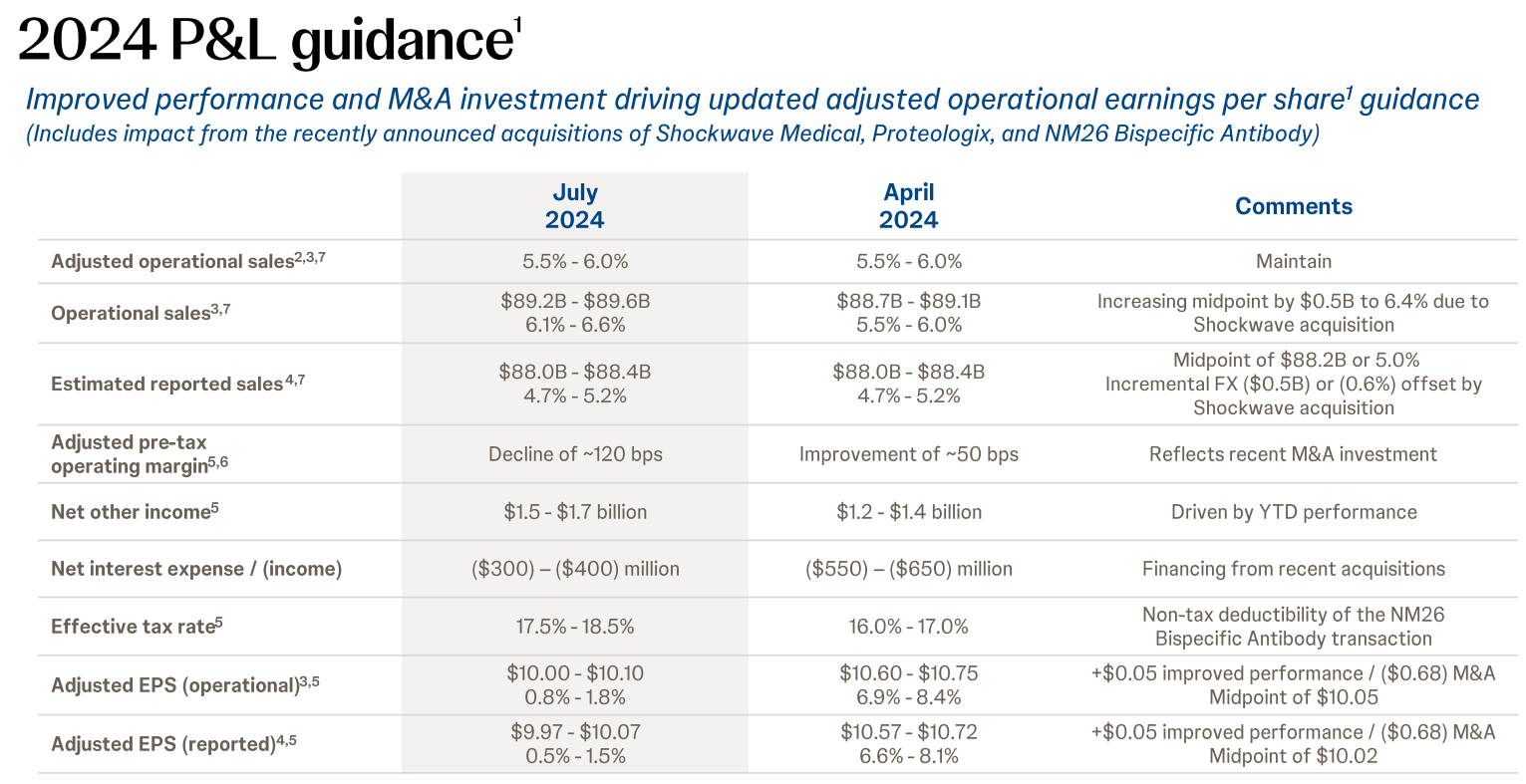 The company maintained its revenue guidance, but lowered its EPS guidance for FY24 due to lower margin and higher tax rate assumptions caused by Shockwave acquisition and non-tax deductibility of the NM26 Bispecific Antibody transactions.