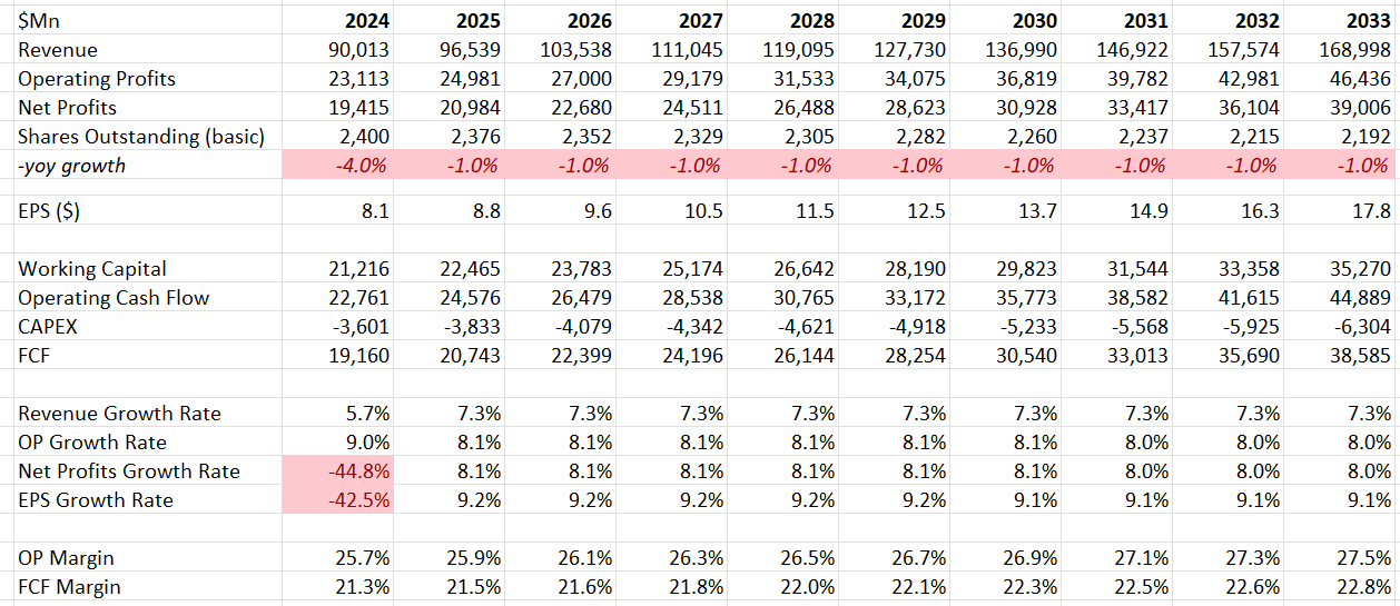 As discussed earlier, I assume Johnson & Johnson will deliver 5.7% revenue growth in FY24. For the normalized revenue growth, I assume Johnson & Johnson can deliver 6% organic revenue growth, presuming the company’s innovative product pipeline could accelerate its Medicine business in the coming years. Additionally, I assume the company will spend 5% of revenue on acquisitions, contributing 130bps to topline growth.
